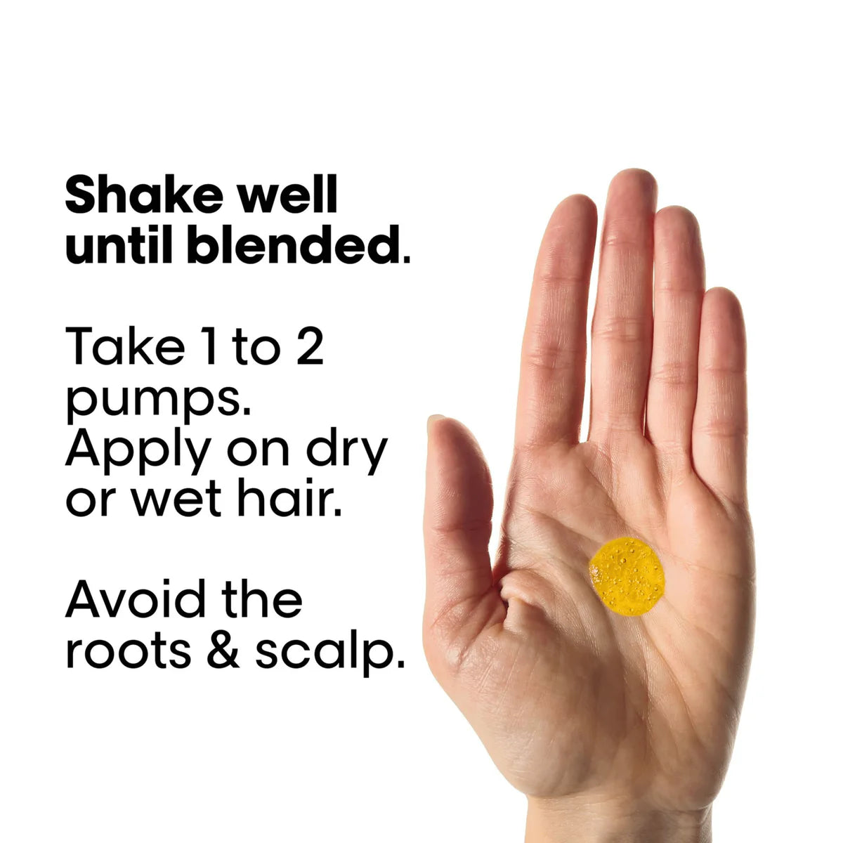 Versez une à deux doses dans la paume de votre main et appliquez uniformément sur les cheveux secs ou mouillés, en évitant les racines et le cuir chevelu.